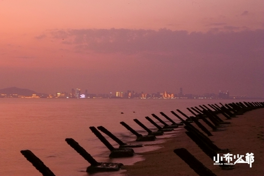 今天來的太晚了,太陽已經西下,剩下彩霞的餘光,遠處看的到廈門的高樓大廈,昔日用在反登入的軌條砦經歷了數載年海水的侵蝕依然屹立不搖的守護著金門海灘。