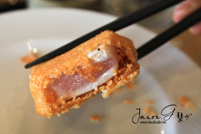 他將魚肉先煎了兩面熟,外面包上了像是酥皮的起士