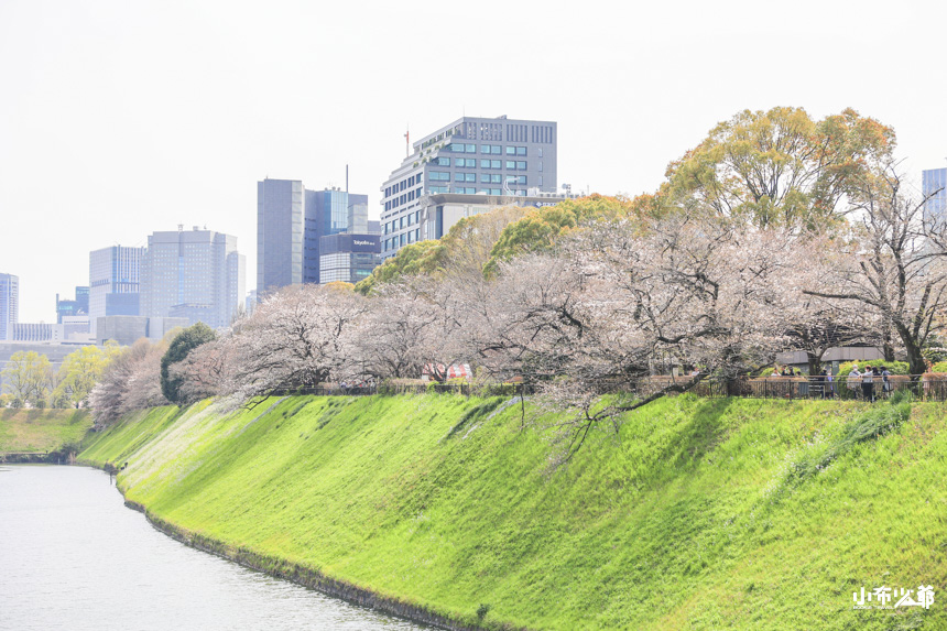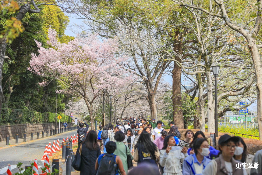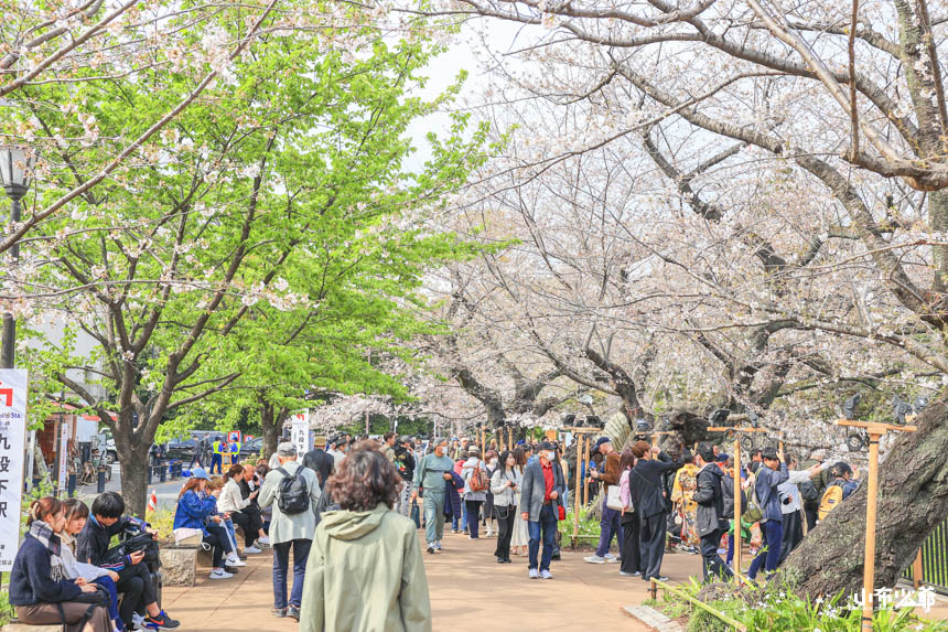 中間有一段在路上可以願跳整條的護城河,堤防上的櫻花延綿到盡頭,相當壯觀
