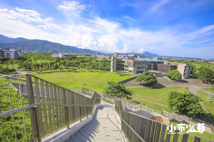 參觀完了室內,看過了周遭,還有個圖書館的山坡梯道,這梯道不長,走完150階便可登高望遠,左可眺望都蘭山、鯉魚山、射馬干山,右邊則是蔚藍的太平洋、美麗的南迴鐵路與利嘉溪平原,是在怎麼樣累,也是要走上去一遊的阿
