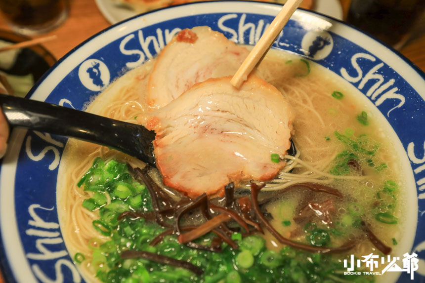 我們點的是最基本款的博多shinshinらーめん,跟一蘭比起來稍油了一些,但是豚骨香也更明顯了,叉燒超級軟嫩,龔少跟小布覺得最特別的是他們家的拉麵,跟台灣的壽麵有異曲同工之妙,細細的不會軟爛,很容易入口
