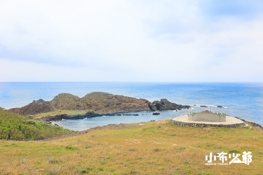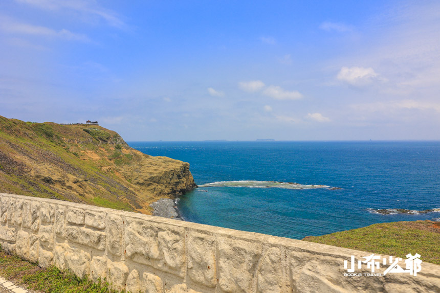 有大片的草皮跟伴手禮商店在旁,想必在七美這裡必是個重要景點,城牆般的道路延伸至山腰間,望出去的大海碧綠又透徹,特別的是這裡左有蛟龍,右有獅子,根本就是風水極佳之地,這的景色真可榮獲七美島景色前三名的