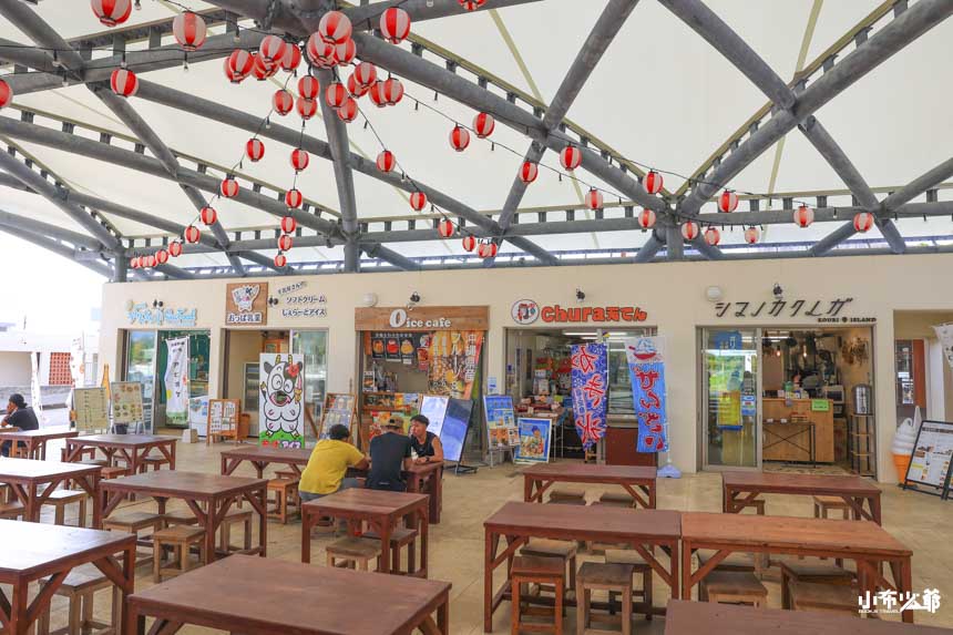 古宇利沙灘旁的廣場休息區其實很加分。這裡有幾個可以購買的甜品與簡單餐點攤位,補充能量不成問題;更重要的是,設有桌椅可以遮陽、坐下來好好休息。