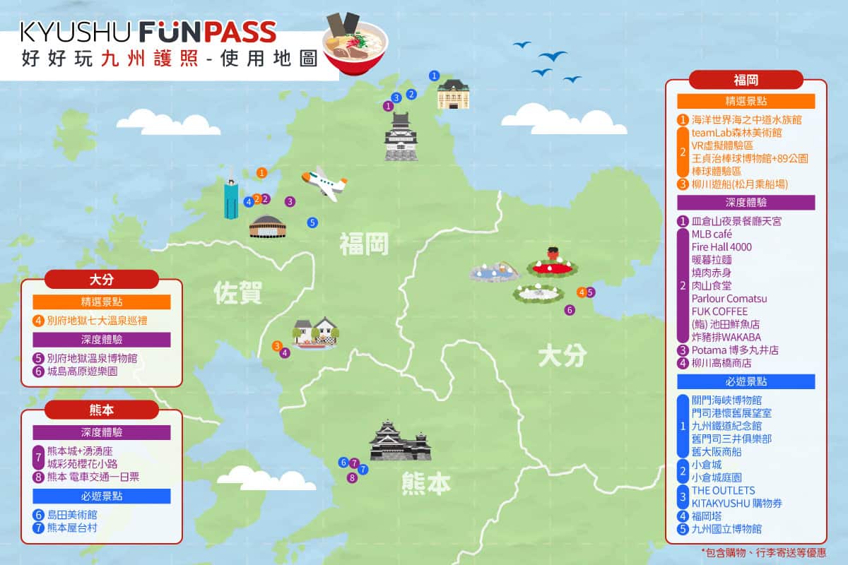 目前景點範圍包括福岡、北九州市、別府、熊本,大部分景點都在福岡與北九州市(小倉、門司港),福岡市區精選景點有超熱門的福岡teamLab森林美術館、海洋世界海之中道水族館,北九州市則有小倉城、關門海峽博物館、門司港懷舊展望室…等等,大分地區則是別府地獄溫泉博物館與別府地獄溫泉套票(兩天票券)。