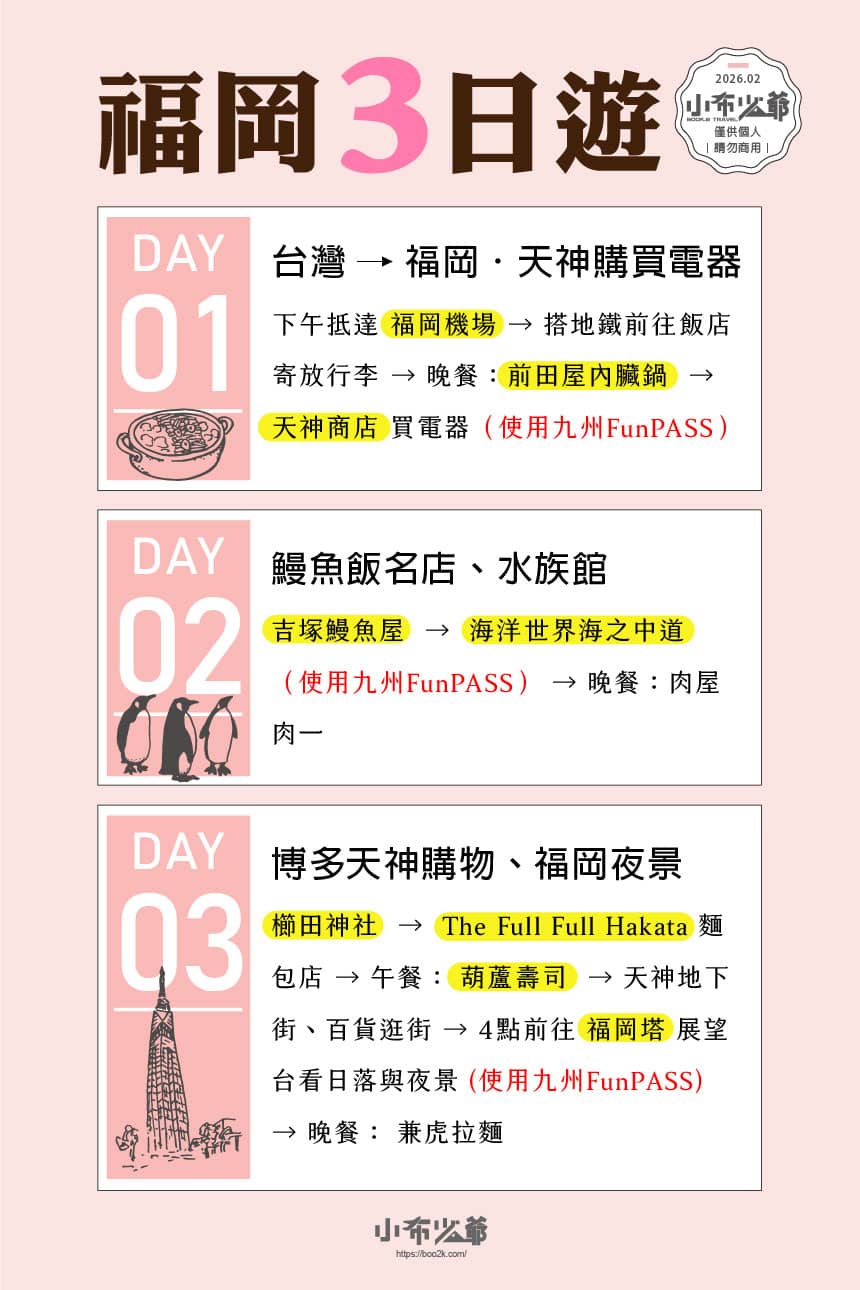 以上是我2026年1月再訪福岡的行程,使用的是全域3合1套票,整個旅程屬於比較漫遊輕鬆的旅行。