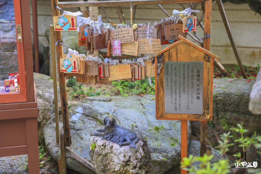 走進西來院的門口,第一眼看到的是一座小巧、乾淨而充滿靜意的庭院。雖然寺院不大,但右手邊立刻就能看到幾個非常有代表性的祈願元素:子安觀音靜靜守護著來訪者,象徵平安與安心;再往裡一點,在小瀑布水聲下方,可以看到象徵結緣與良緣的 良緣地藏,水流搭配地藏像的畫面讓人覺得特別療癒。而旁邊的 良母犬神像,則象徵安產與母子平安。