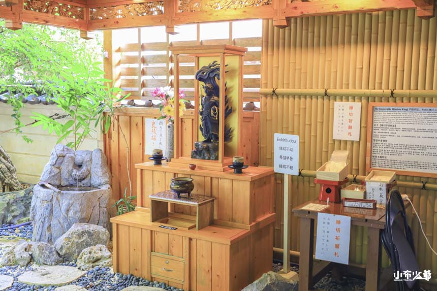 許多人會先被庭院與右側的祈願區吸引,但其實左手邊有點像「隱藏路線」。因為外觀側面看起來像是車庫入口,加上玄關不太顯眼,許多旅人會直接略過。但若你往那裡走近一點,會先看見一尊象徵「斬惡緣」的 緣切不動,是很多人想擺脫壞運、壞緣時會前來參拜的地方。