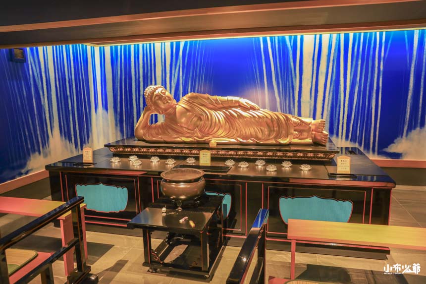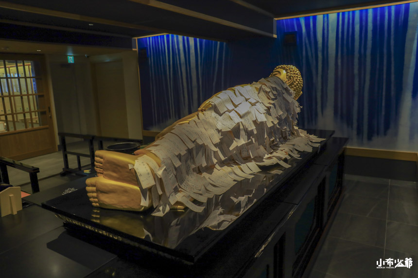 更令人驚喜的是,沿著牆慢慢往裡走,會出現一尊少見的 臥佛像。臥佛在日本寺院中非常罕見,西來院能擁有一尊,讓人多少會覺得有些神秘感。走到臥佛背面,更會看到牆面上貼滿了祈願小紙片,滿滿的心願寄託在佛身後,看起來似乎相當靈驗,也讓這個角落多了一種「守護」的力量。