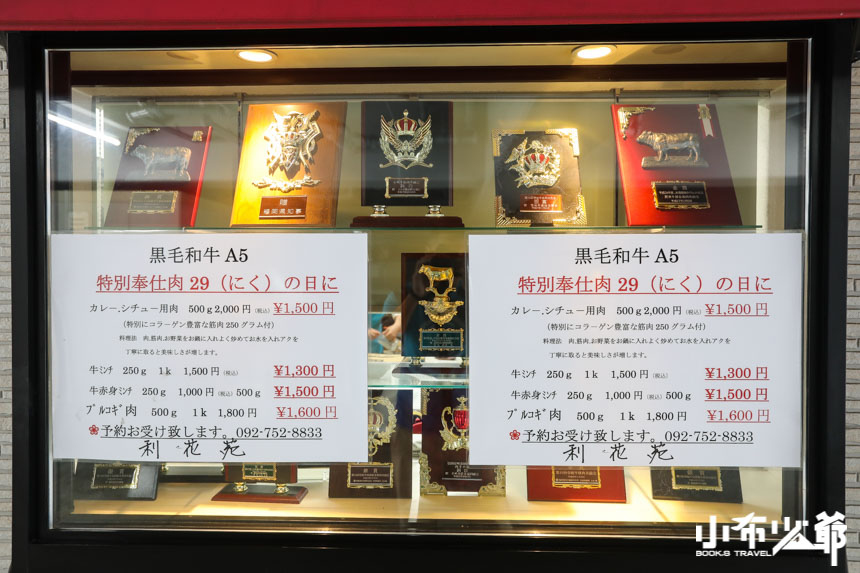 樓下的櫥窗放了許多的獎牌跟獎狀,一般來說有些店家會挑選特定的牛肉來買,但是利花苑的獎看似來自九州各地,這樣的店家不是眼光極高,就是相當的有經驗啊,對了大家知道食べログ嗎,燒肉利花苑可是全日本的百名店之一喔!!!!
