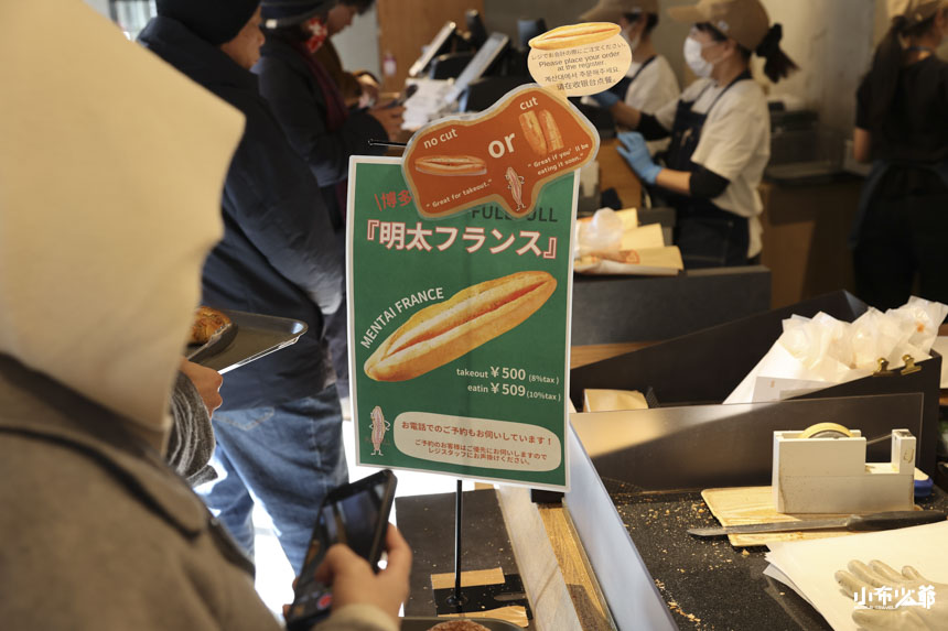 FULL FULL 明太子法國麵包一個 500 日圓,可以選擇整根帶走,也可以請店家直接幫忙切好,價格都一樣。